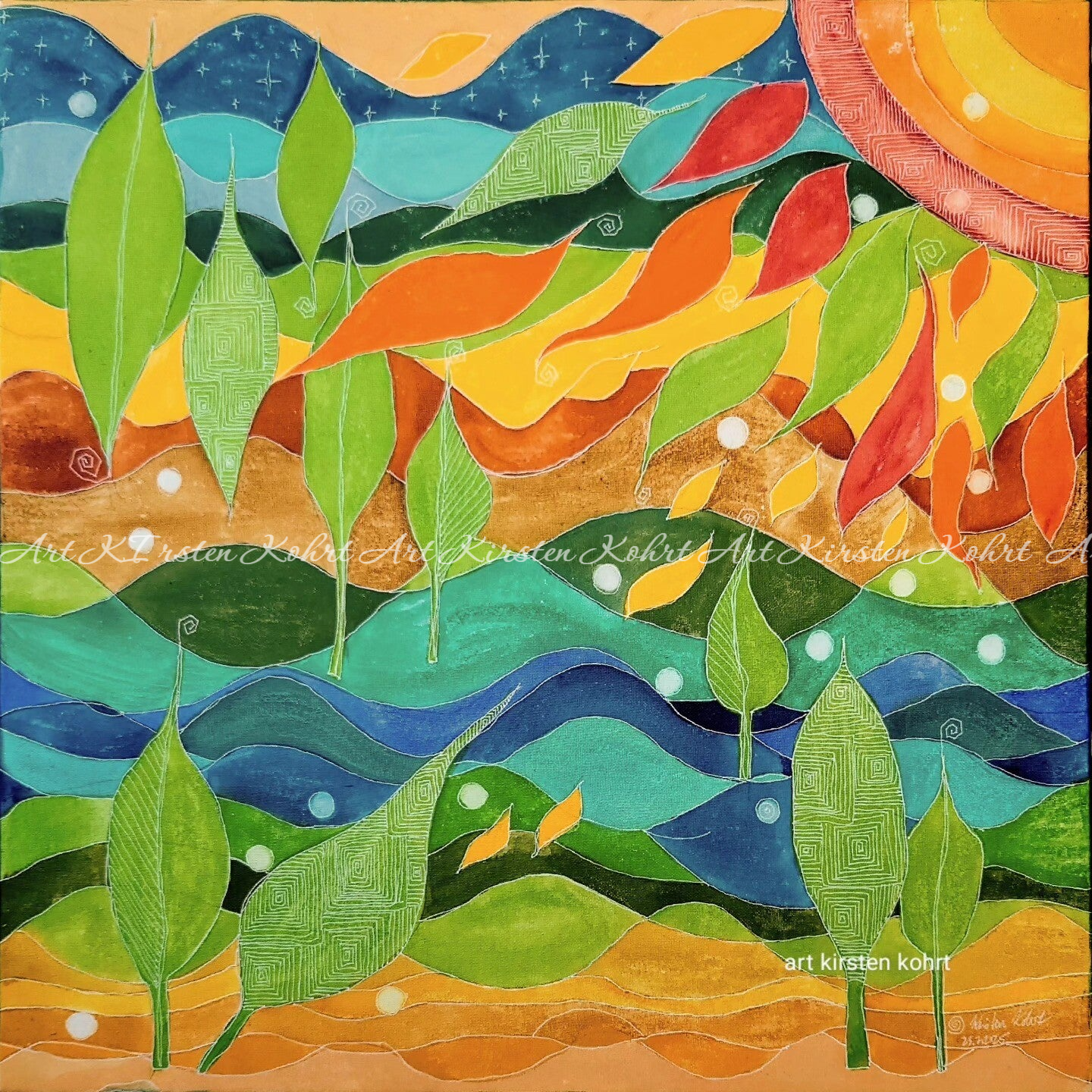 „DIE MAGIE DER ELEMENTE“ Die Elemente, die hier künstlerisch umgesetzt wurden und eine hochschwingende und heilsame Wirkung auf ihre Umgebung haben: Holz, Feuer, Erde, Metall und Wasser (chinesisch) Wind/Luft und Raum (tibetisch). Jede Farbe, jede Form, sogar jede Platzierung hat ihren Zweck im großen Ganzen Dennoch habe ich das Motiv intuitiv und frei gemalt.